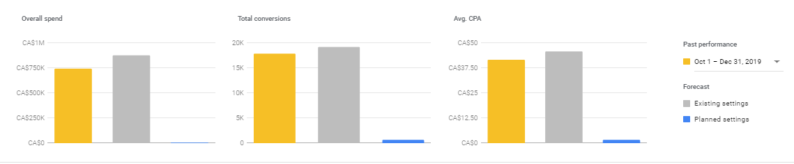 Le planificateur de performance est un outil de prévision facile à utiliser qui utilise le machine learning et l’historique de votre compte Google Ads afin de vous aider dans la gestion de votre budget et l’optimisation de votre retour sur investissement. Il aide à répartir votre budget total sur vos campagnes afin que chacune de ces dernières performe le mieux possible. Par exemple, si votre budget total est de 1000 $ et que vous avez 10 campagnes, le planificateur de performance vous guidera sur comment répartir le 1000 $ pour l’obtention d’un maximum de conversions.