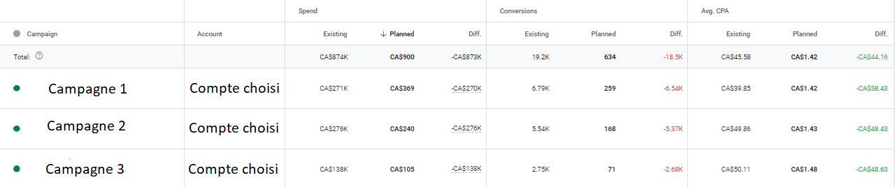 Le tableau de prévisions à son tour propose des statistiques détaillées concernant les dépenses, la statistique clé et la statistique cible. Dans l’exemple suivant, présentant trois campagnes du compte uniquement, nous avons les dépenses, les conversions et le coût par acquisition moyen pour chaque campagne. Pour chaque statistique, il est possible de connaître les résultats planifiés, actuels et la différence entre les deux. D’ailleurs, il est possible de sélectionner une campagne et d’y apporter des modifications au niveau des paramètres.